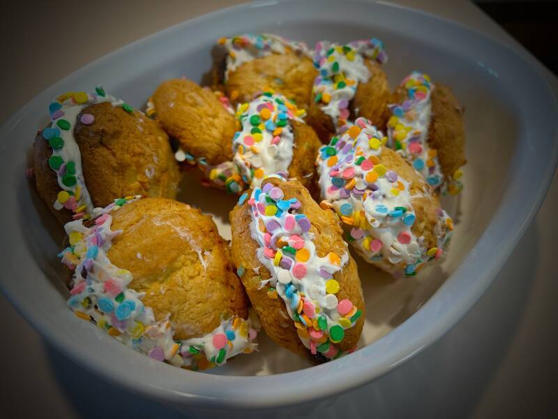 The next challenge was the marshmallow icing. It didn't state whether to have the butter at room temp, but I assumed to mix it it would have to be. Well the icing was ridiculously runny and got everywhere. I kept adding powdered sugar, but the cookies kept sliding apart. I put them in the fridge and hoped they solidified. They looked real messy.